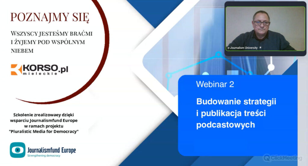 Cykl obejmował serię spotkań realizowanych w formule online, podczas których uczestnicy zdobywali kompetencje z zakresu tworzenia podcastów, nagrywania i montażu materiałów audio oraz budowania strategii treści w środowisku cyfrowym. Szkolenia prowadzone były w przystępnej, warsztatowej formule, a każde spotkanie trwało 60 minut i koncentrowało się na konkretnych umiejętnościach praktycznych.